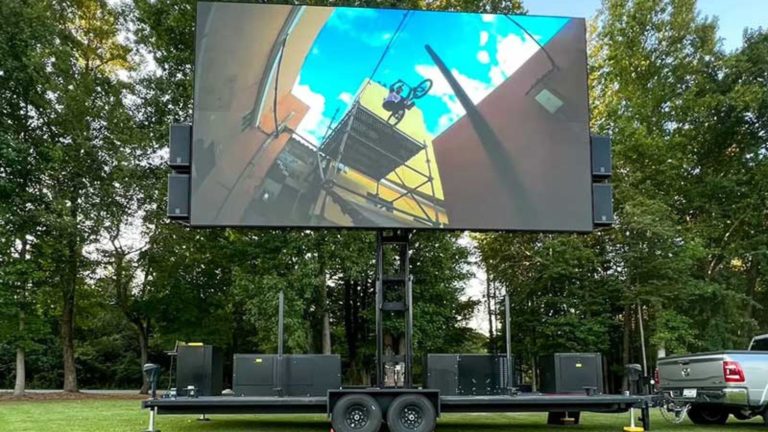 We provide mobile LED screen trailer rentals, hydraulic lift jumbotrons, live broadcast integration, multi-camera streaming, video playback and switching, professional audio systems, and internet connectivity via Starlink or mobile hotspot for venues without Wi-Fi.